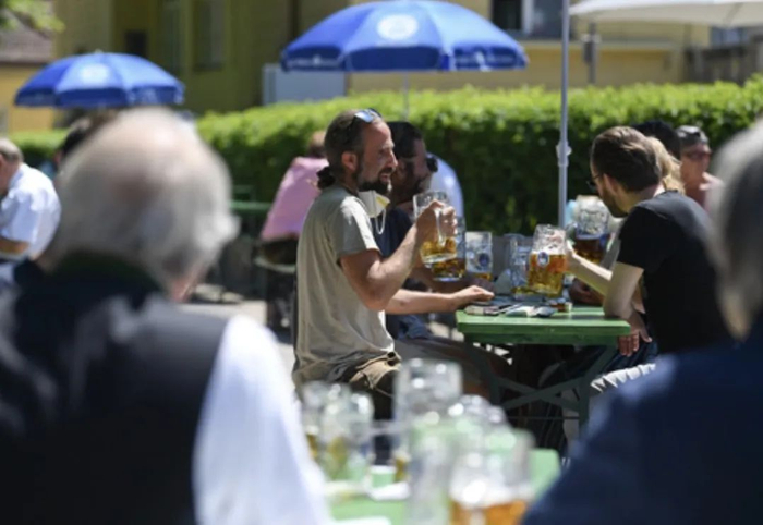 5月18日,人们在德国慕尼黑英国公园的啤酒花园内畅饮。新华社/路透
