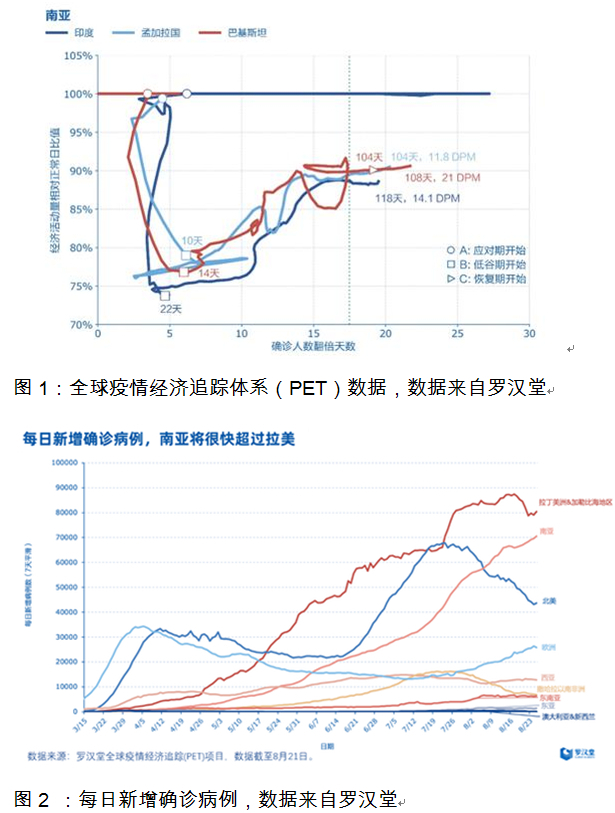 南亚国家的疫情经济曲线的走势极为相似,病例翻倍天数仍在20天左右,预计南亚地区的疫情将继续恶化。截至8月26日,南亚地区每天新增诊断病例数已经接近拉美地区。据印度新德里电视台(NDTV)回顾,过去几天,印度每天报告近10万例新冠肺炎感染病例。截至9月7日,印度已经超越巴西,成为全球感染新冠肺炎病例第二多的国家。