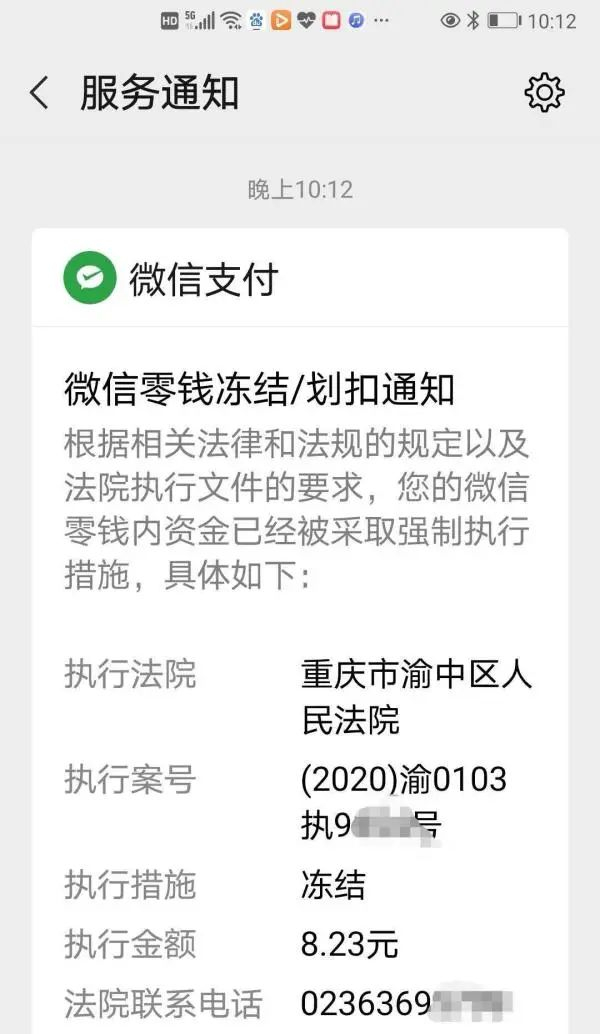 涉事农牧民叶利向澎湃新闻提供的手机截图显示,7月30日晚上10:12,他收到“微信零钱/划扣通知”,重庆市渝中区法院根据执行案号“(2020)渝0103执9XX4号”, 叶利的微信钱包内的8.23元已被冻结。随后,他发现,自己的银行卡也被全部冻结。