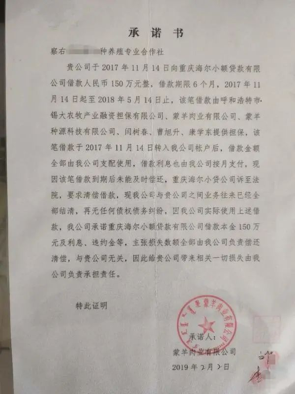 一份盖有蒙羊肉业有限公司公章、落款时间为2019年2月2日的《承诺书》显示,蒙羊肉业有限公司向康学东担任法定代表人的察右合作社承诺,重庆海尔小额贷款有限公司借款本金150万元及利息、违约金等,主张损失数额全部由蒙羊肉业公司负责偿还清偿,与察右合作社无关,因此给察右合作社带来相关一切损失由蒙羊肉业公司负责承担责任。