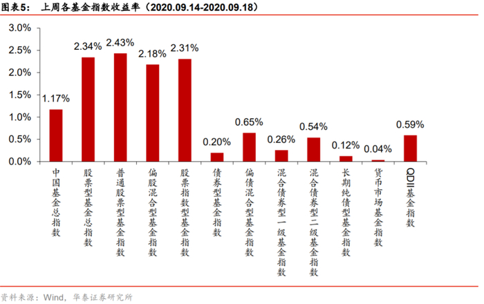 上周各类型基金指数表现较好。具体地,中国基金总指数收益率为1.17%,股票型基金总指数收益率为2.34%,债券型基金指数收益率为0.20%,货币市场基金指数收益率为0.04%,QDII基金指数收益率为0.59%。