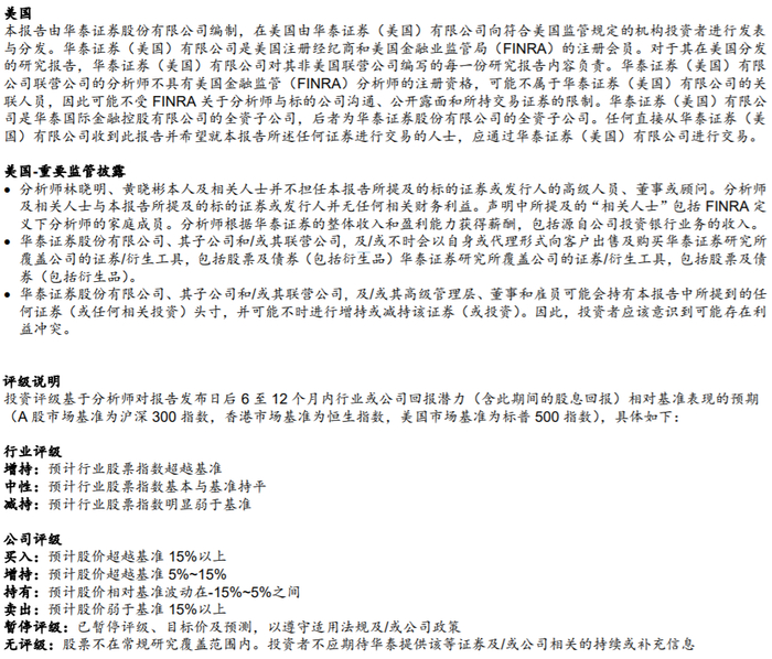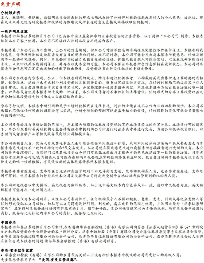 在任何情况下,本公众号中的信息或所表述的意见均不构成对任何人的投资建议。订阅者不应单独依靠本订阅号中的内容而取代自身独立的判断,应自主做出投资决策并自行承担投资风险。订阅者若使用本资料,有可能会因缺乏解读服务而对内容产生理解上的歧义,进而造成投资损失。对依据或者使用本公众号内容所造成的一切后果,华泰证券及作者均不承担任何法律责任。