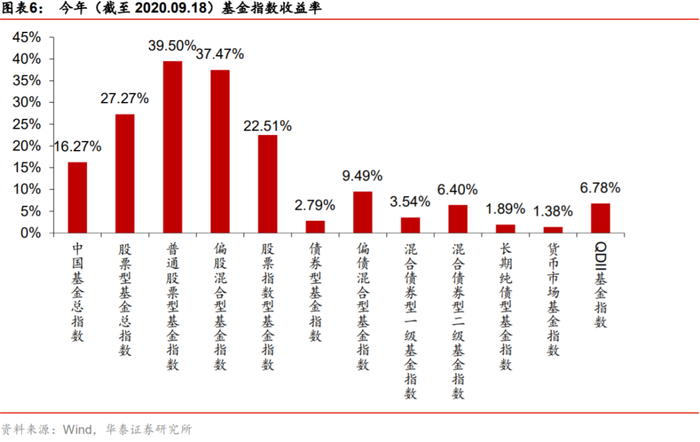 今年以来,以股票为主要投资标的的普通股票型、偏股混合型基金指数的收益率相对较高,领先于以债券为主要投资标的的混合债券型、长期纯债型基金指数。QDII基金指数表现弱于股票型基金总指数,今年以来收益率为6.78%。