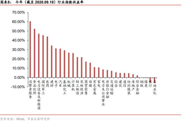 年初至今,消费者服务行业收益率最高,食品饮料和电力设备及新能源次之,煤炭,银行行业和石油石化收益率最低。具体地,消费者服务行业收益率60.42%,食品饮料行业收益率52.34%,医药行业收益率47.09%。