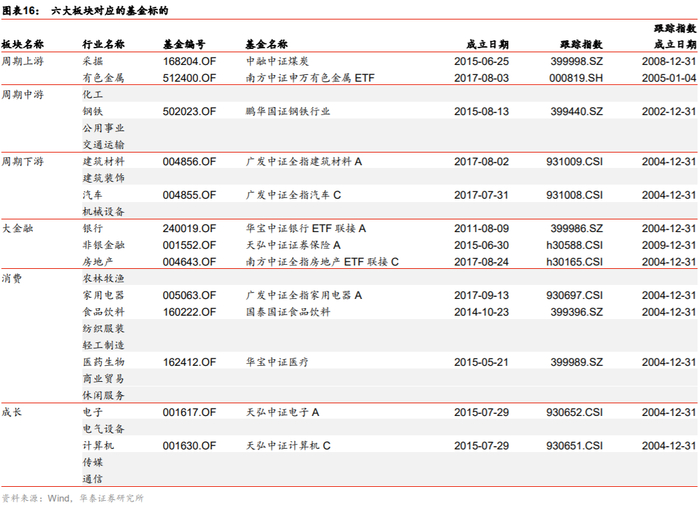 因此,在短期内,我们推荐配置成长风格的大成深证成长40ETF、电子行业的天弘中证电子A(001617.OF)和计算机行业的天弘中证计算机C(001630.OF)。在中长期内,我们推荐采掘行业的中融中证煤炭(168204.OF),钢铁行业的鹏华国证钢铁行业(502023.OF),建筑材料行业的广发中证全指建筑材料A(004856.OF),汽车行业的广发中证全指汽车C(004855.OF),以及有色金属行业的南方有色金属ETF(512400.OF)。