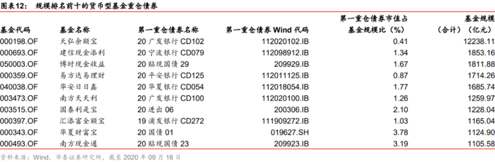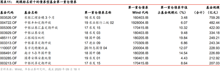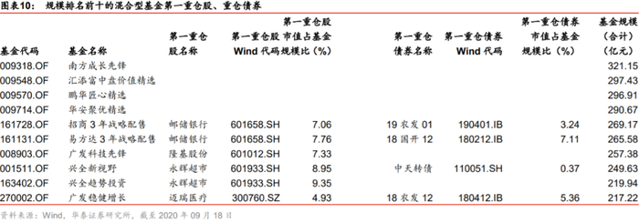 按照图表1中的基金分类,根据基金披露的最新持仓数据(即2020年年中报披露的持仓),以下图表给出了各类型基金中按基金规模排序前十名的基金里,每只基金第一大重仓股票或者债券的情况。