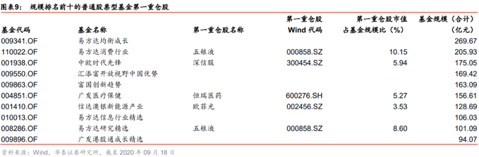 对于股票型基金,考虑到被动指数型基金的重仓股票与所跟踪的指数密切相关,此处仅呈现普通股票型基金的重仓情况。在基金规模(合计)前十名的普通股票型基金中,基金的第一重仓股包括五粮液、深信服、恒瑞医药和欧菲光。