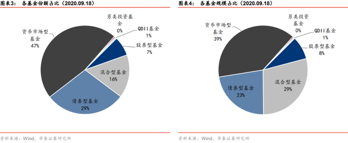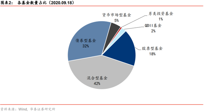 根据2020年9月18日最新数据显示,在所有基金产品中,混合型基金数量最多,其次是债券型和股票型基金,货币基金的数量相对较少,但是其规模占比接近40%,位于首位。上周(2020.09.14-2020.09.18)股票型基金、混合型基金总规模分别上升2.24%和2.40%,另类投资基金总规模下降不足1.0%,债券型基金、货币市场型基金和QDII基金总规模上升不足1.0%。