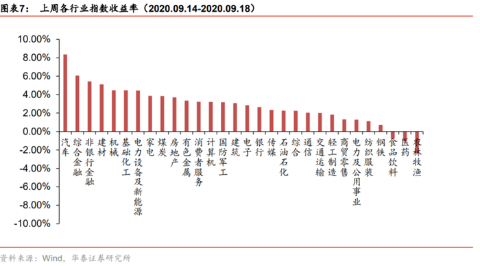 上周汽车行业涨幅最大,涨幅为8.35%;综合金融行业指数涨幅次之,为6.06%;第三名为非银行金融行业,涨幅为5.43%。上周全部3个行业指数录得负收益,其中医药和农林牧渔最低,分别为-1.06%,-2.34%。