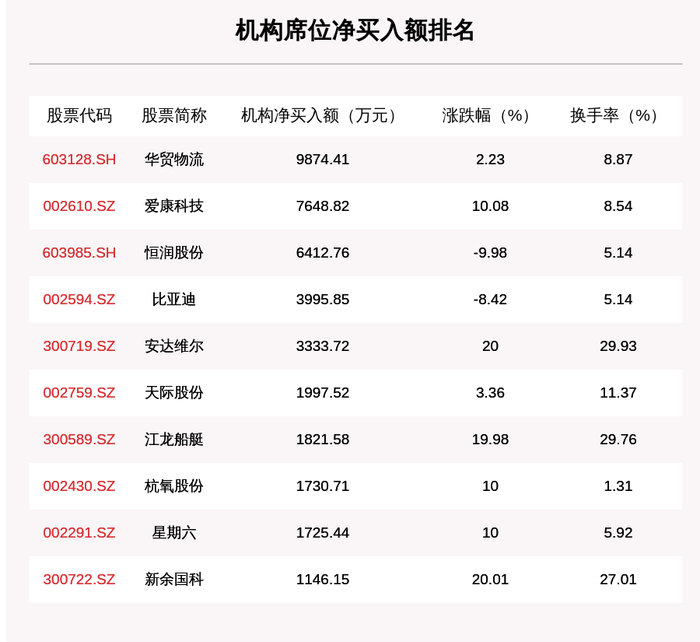 在龙虎榜中,涉及机构专用席位的个股有17只,净买入额前三的是华贸物流、爱康科技、恒润股份,分别为9874.41万元、7648.82万元、6412.76万元。