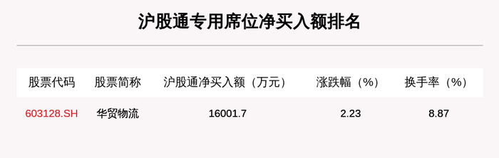 在龙虎榜中,涉及沪股通专用席位的个股有1只,华贸物流的沪股通专用席位净买入额最大,净买入1.6亿元。