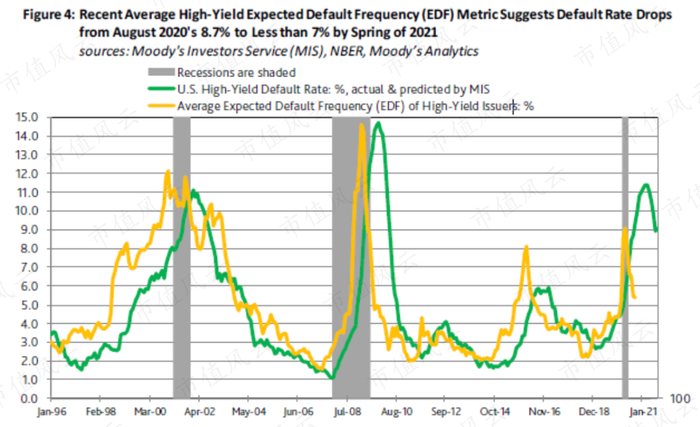 再来看另一个由市场驱动的违约率线性预测指标,穆迪分析公司分析美国/加拿大高收益发行人的预期违约率指标(Expected default frequency metric,下称“EDF”)均值,得出的结论与高收益债券息差的预测一致。