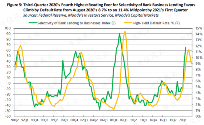 根据历史记录推断,截止2020年第三季度银行商业贷款选择性指数为65.0,将预示着2021年第一季度高收益违约率的中值在11.4%附近。