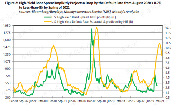 二、高收益债券息差显示,2021年春季违约率将低于8%