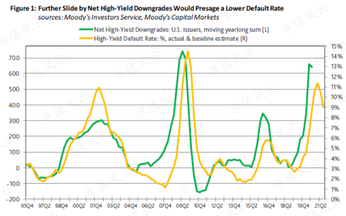 一旦连续一年的净降级数总和出现下调趋势,高收益债券违约率可能会出现明显下降。
