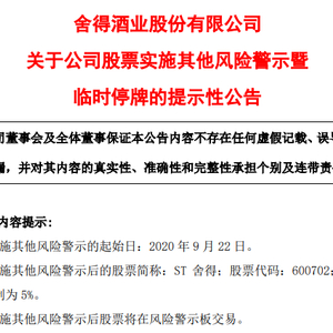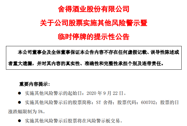 9月21日,舍得酒业发布了《关于公司股票实施其他风险警示暨临时停牌的提示性公告》,称公司将在9月21日停牌一天,恢复交易后股票名称将更名为“ST舍得”,股票的日涨跌幅限制为5%。恢复交易后,股票将在风险警示板交易。