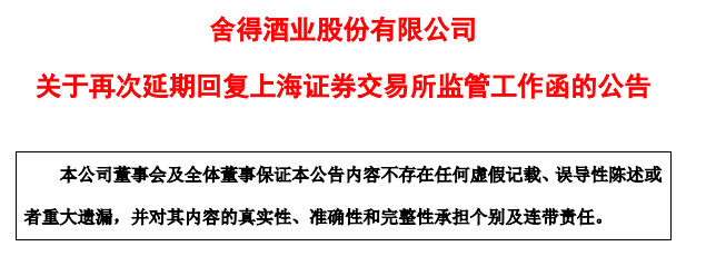这一次,舍得酒业对监管函的回复似乎“难产”了。截止至9月18日,舍得酒业两次发布延迟回复监管函的公告。