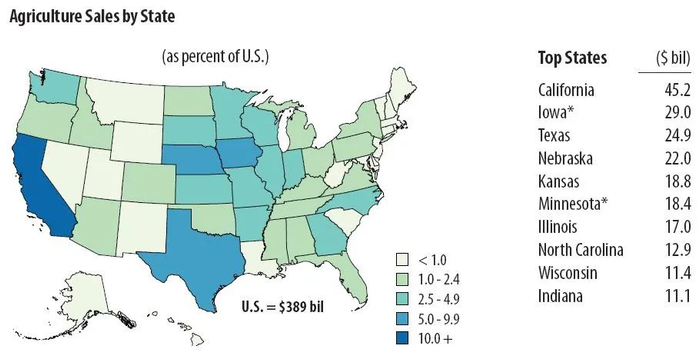 根据美农业部农业经济研究中心发布的2017年农业经济统计数据(最新,该数据每5年发布一次)显示,加州是美国最重要的农业州和畜牧州,全州共种植了200多种商品作物,每年农业产值500亿美元左右,在全美50个州里面常年占第一,产值比第二名高出50%。