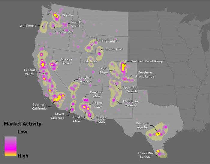 水资源交易发生在每个西部州,共有20多个不同的区域,这些市场已经在地方和地区各种市场条件以及公共政策下形成,并最终满足因不断增长和变化的供水需求。