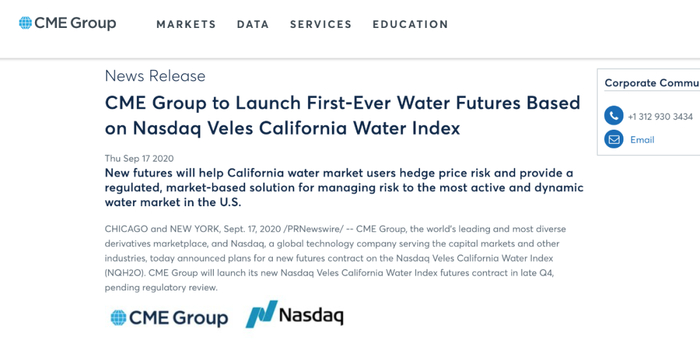 近日,美国当地时间9月17日,全球最大期货交易所芝加哥商品交易所集团(CME Group)宣布, 他们将在今年年底前推出全球首张水价格期货合约,每份合约将代表10英亩英尺的水,并且该合约将以纳斯达克韦莱斯加利福尼亚水指数(NQH2O)为标的进行交易结算,该指数涵盖了整个加利福尼亚州的水价格。