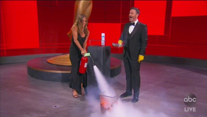 比如,吉米·坎摩尔一开场就自嘲是冒着生命危险来当这届的主持人;之后,他还和嘉宾詹妮弗·安妮斯顿一搭一唱,点燃写有获奖人姓名的信封,以阻止病毒传播,谁料火势太大,一时难以控制,安妮斯顿只好赶紧取来灭火器。