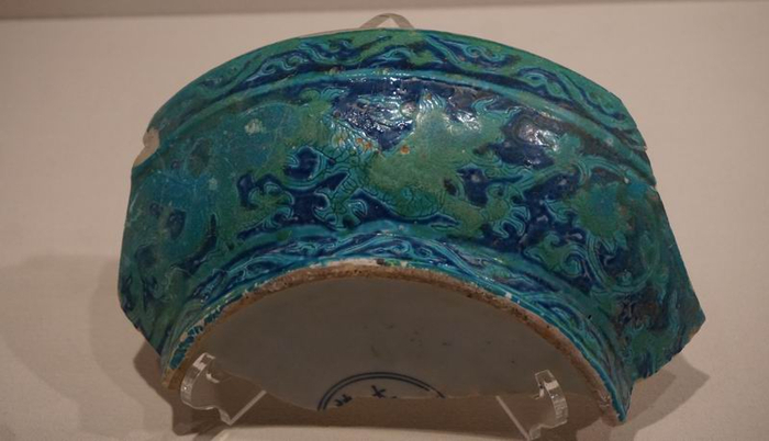那些被当即打碎、未见天日的和在时间中被“折叠”的瓷器也储存了丰富的历史信息。如新发现的宣德、成化瓜皮绿釉器,发色鲜亮,很有该时代的代表性;而同样是颜色釉的一件蓝釉刻应龙纹缸,体量巨大,外壁及口沿上施蓝釉,内壁施白。外壁肩部及近底处均刻卷草纹一周,腹部主题纹饰则为暗刻海水应龙纹,可见应龙舞于海浪之中,浪花翻卷。外壁口沿处有“大明宣德年制”六字横排的楷书款。现场的一件宣德斗彩残件小而精美,可能是梅瓶盖之壁。通体施釉,外壁下端饰一周青花卷草纹,腹部以青花五彩饰莲池纹,釉上填色处可见釉下刻线;以矾红彩填绘莲花,以绿彩作莲叶、浮萍等穿插其间,并以青花勾勒出水波纹,动感十足。 蓝釉刻应龙纹缸