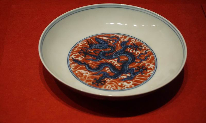 釉里红瓷的烧造,则对窑内气氛和温度的掌控要求极高,所以,与青花瓷相比、釉里红瓷产量很低,更显稀珍。另有青花釉里红瓷,同时使用两种釉下彩料描绘纹饰,烧成后红、蓝辉映增强了物象表现力,但烧造难度却更大。即使是窑事颏繁的宣德御,其青花釉里红瓷呈色完美者也堪称凤毛麟角。明宣德朝以后,青花釉里红瓷的烧造逐渐衰退,成功的作品殊为少见。 青花加矾红彩海水龙纹盘