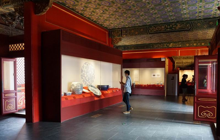 去年十月,北京故宫景仁宫曾展出日本最著名的、最能够代表日本侘寂之美与残缺之美的名物“马蝗绊”,六枚金属钉锔补的青瓷碗很有脆弱的美感。今天,同样是在景仁宫的新展“御瓷新见”中,观众能看到更多有破碎美感的明代景德镇御窑出土的落选品、废品、供余品(修复件或残片标本),这些瓷器身世坎坷,在朝廷派去的督陶官的严苛审视之下,为了不让帝王使用的瓷器流落到寻常百姓的手里,所有官窑的贡余品、有瑕疵的次品将一律集中打碎,就地掩埋,这某种程度上维护了帝制的尊严、保证了官窑的水准,也正如我们后来看到的,存世精美完整的官窑瓷器凤毛麟角。 展览现场,故宫景仁宫