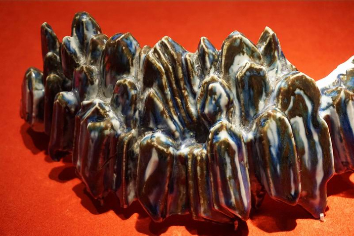 景德镇市人民政府副秘书长程念革介绍,展览中的很多器物的残片也显示出官窑的实验精神,很多是记载中没有的、烧制出来器型也不完整的,比如下面的一件可能是博山炉那种香薰炉的盖子的部件,是青花和红釉的、上面有孔,这是非常少见的。 青花山形器座