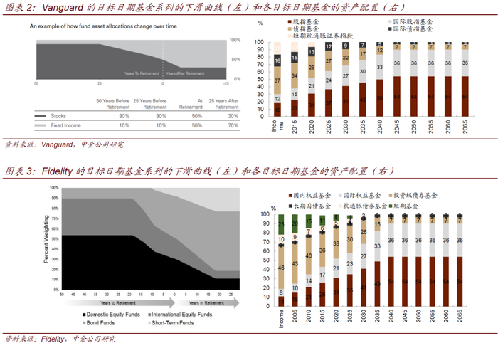 全球许多国家和地区都有目标日期基金产品,其中美国市场的目标日期基金规模最大,占全球的比重高达90%。美国目标日期基金市场的壮大得益于政策对于个人养老金账户的鼓励。从美国经验来看,目标日期基金通常以系列的形式出现,间隔一般设为5年,各家基金公司一般会在距离退休日期44-48年时推出一直对应最新目标日期的目标日期基金。美国平均65岁退休,提前44年推出,目标客群则是21岁大学本科毕业刚开始工作的年轻人;提前48年推出,目标客群则是17岁高中毕业的年轻人。