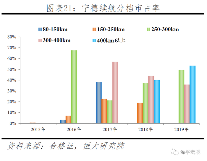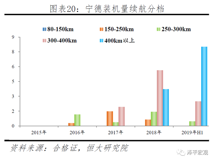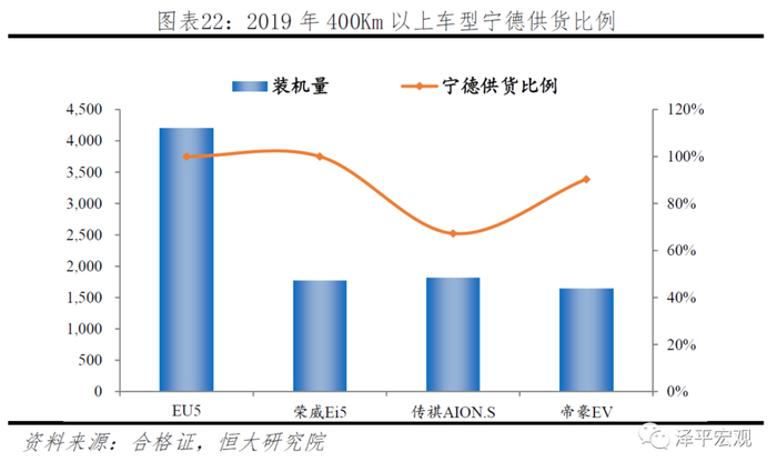 2018至2019年,随着补贴政策对能量密度要求不断提高,电池由低端三元向高端三元转变,宁德装机增长主要源于400km以上车型。2018年政策降低低续航车型补贴,提高高续航车型补贴,能量密度要求105Wh/kg:150-250km补贴由3.6万降低到2.4万,250-300km由4.4万下降至3.4万,300km以上补贴由4.4万上升至4.5万,一倍补贴的标准由90Wh/kg提升至120Wh/kg;2019年,补贴政策全面退坡,能量密度要求提升至125 Wh/kg:250km以下补贴全面取消,高续航车型地方补贴全面取消,国补也降低50%以上,1倍补贴能量密度要求提升至160Wh/kg。2017-2019年新车推荐目录中,电池平均能量密度由100Wh/kg逐步达到160Wh/kg。宁德率先量产NCM811三元电池且是当时唯一能大规模供应高能量密度电池的企业,在300-400km、400km以上车型装机市占率不断提高。2019年销量排行前10的车型中,共6款车续航超过400km,除2款比亚迪自供外,其余均为宁德主供,其中北汽EU5、上汽荣威Ei5全部电池均为宁德提供,广汽传祺AION.S和吉利帝豪EV宁德供应占比分别为67%和90%。