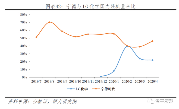 2020年以来,宁德在国内的份额出现明显下降。从2019年下半年,宁德装机量市场份额一直维持在50%以上。2020年2月,随着特斯拉的量产、LG的进入,宁德时代当月市占率下降15pct。与此同时LG市场份额出现显著上升,当月装机39%基本与宁德时代持平,此后3、4月维持在20%水平。