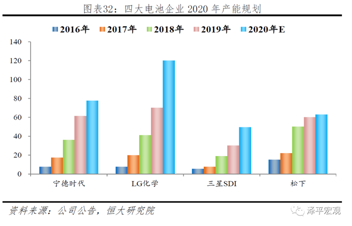 宁德、LG化学与三星、松下产品力没有实质区别,差距的拉开主要源于战略规划的差异。产能规划上,宁德与LG积极响应配合客户扩产,而松下和三星较为保守。宁德与LG化学近年产能扩张最快,2016-2019年四年间分别增长了7.1和8.3倍,其中宁德时代2020产能规划分别为77.4 GWh,LG化学产能规划为120GWh。松下和三星四年间产能仅增长3倍和5倍,松下2020年产能规划63GWh,对比2019年仅新增3GWh。