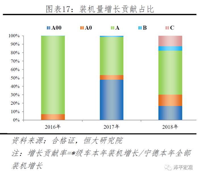 2017年起补贴政策向高续航车型和高能量密度电池倾斜,电池技术路线首先由磷酸铁锂向三元转型,这一阶段宁德市占率提升源于A00车型三元装机贡献。在我国新能源汽车发展初期,铁锂电池曾广泛应用于乘用车,2015年磷酸电池装机市占率达到了53%。2017年政策对低续航乘用车超额补贴,并首次对电池系统能量密度提出要求:250km以下车型单车补贴3.6万,250km以上车型均为4.4万,电池系统能量密度90(含)-120Wh/kg补贴系数为1倍。磷酸铁锂电池能量密度低的短板凸显,2017年铁锂装机市占率22%,同比下降22pct,三元则逐渐成为主流。2017年宁德乘用车装机量4.1GWh,同比增长2.7GWh,其中A00和A级车分别贡献1.3GWh和1.2GWh。值得注意的是,2017年A00级车型全行业装机新增3.1GWh,其中宁德新增1.3GWh,占比达42%,而宁德主要增长源于北汽EC180车型,达到1.1GWh。
