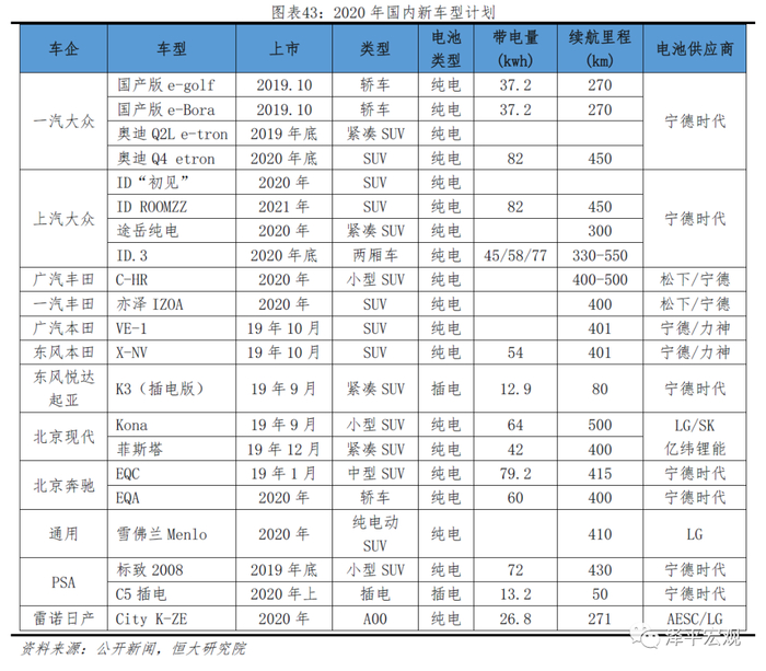 后补贴时代车型升级速度有所减缓,但国内市场高端化趋势不改。2020年合资车型的放量是市场主要的增长点,而宁德为合资车企主要供应商。未来随着双积分考核进一步严格,合资车型在达标上面临较大的压力,因此也加紧了在电动化方面的布局。2020年1-4月实际情况来看,合资车型产量排名前十车型合计24740辆,这些车型基本都是终端市场的畅销款车型。