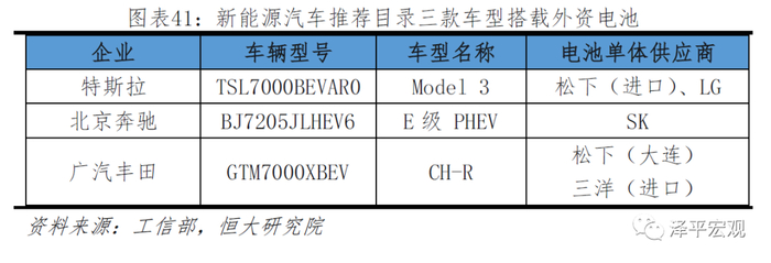 另外,工信部2019年第11批新能源汽车推荐目录中,有3款车型搭载了外资动力电池,分别是特斯拉Model 3搭载松下和LG化学的电池、奔驰E级新能源搭载SK电池、丰田CH-R EV搭载了松下电池。