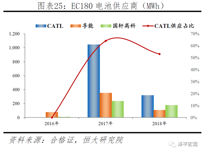 同时期二线企业由于缺乏短期内产能快速扩张能力,难逃边缘化的命运。北汽A00车型EC180就是一个典型的例子。这款车是2017年销量最高的车型,产量达到7.7万辆,其主要供应商为宁德,占比达到64%。而EC180在2016年电池供应商分别为孚能(75MWh,主供三元电池)和国轩高科(10MWh,主供磷酸铁锂)。2017年该车型装机量1.6GWh,而三元供应商孚能2016年和2017年产能分别为0.4GWh和1.3GWh,无法积极满足车企需求。