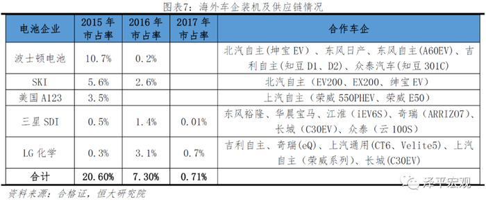 2015年,我国电池企业发展仍然处于起步阶段,国内厂商尚不具备与海外电池企业竞争的实力,“白名单”在发展初期为本土电池企业发展壮大赢得了宝贵的时间。当时国内动力电池生产企业数量众多,技术水平参差不齐,产能普遍低下。截至2014年底,我国锂电池生产企业多达177家,而新能源汽车销量不足7.5万辆。与此同时,海外电池企业起步较早,在技术、性能及成本上均领先国内企业,成为不少本土新能源车企的首选。2015年海外电池企业装机市占率达到20%以上,且产品以高端的三元电池为主,客户均为北汽、吉利、一汽等一线品牌。2015年11月11日,国家颁布了《汽车动力蓄电池行业规范条件》企业目录(第一批),新能源汽车所使用的电池必须进入《电池行业规范》目录,否则使用该电池的新能源车辆将无法获得补贴,外资电池企业并没有进入这份名单。白名单推出之后,海外电池企业在乘用车市场上装机占比由2015年20.6%下降到2016年7.2%、2017年0.71%。波士顿电池、美国A123等海外电池企业纷纷退出中国市场。
