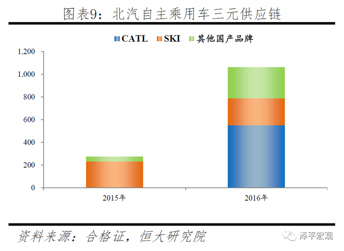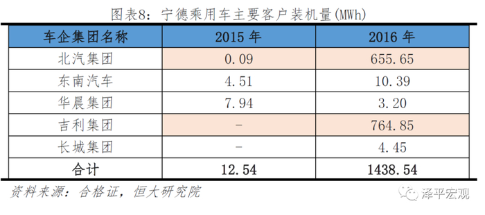 2016年宁德把握海外电池企业退出机会,打入一线车企供应链。2015年宁德乘用车领域主要客户为宝马,由于车企自身战略,整体装机量较低。2016年宁德装机量出现大幅增长,主要源于对北汽和吉利供应链的突破。其中北汽集团装机655MWh占比46%,吉利集团765MWh占比53%。2015年北汽和吉利三元主要供应商分别为SKI和波士顿电池,占比达到85%和53%。而2016年,白名单推出后其供应量向更多国产供应商开放,其中宁德供货占比达到了52%和58%。