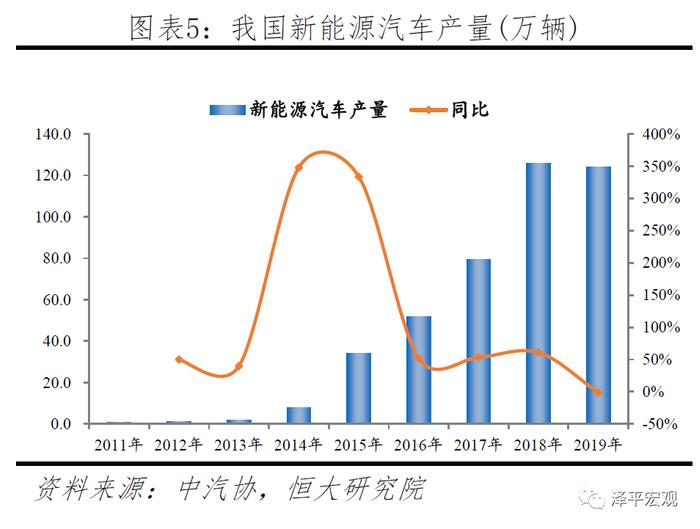 2009年1月,“十城千辆节能与新能源汽车示范推广应用工程项目”启动,我国正式开始对新能源汽车产业的大规模扶持,新能源汽车产量由2011年0.8万辆增长147倍至2019年123.9万辆,而随着新能源汽车产销的增长,对电池的需求也迅速扩大。2015年动力电池装机量15.6GWh增长至2019年52.4GWh,累计增长近5倍。