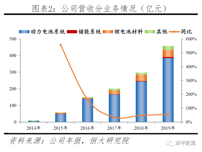 当前公司主要经营新能源汽车动力电池系统、储能系统的研发、生产和销售,其中动力电池是公司主要业务。2019年公司营业收入457.9亿元,对比2014年增长52.8倍,复合增长率达到121%;其中动力电池业务385.6亿元,占比达到84%。公司业务国内业务占比达到95%以上。