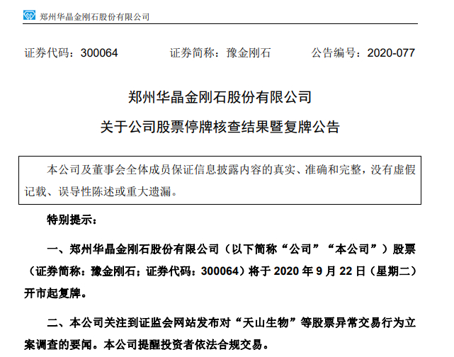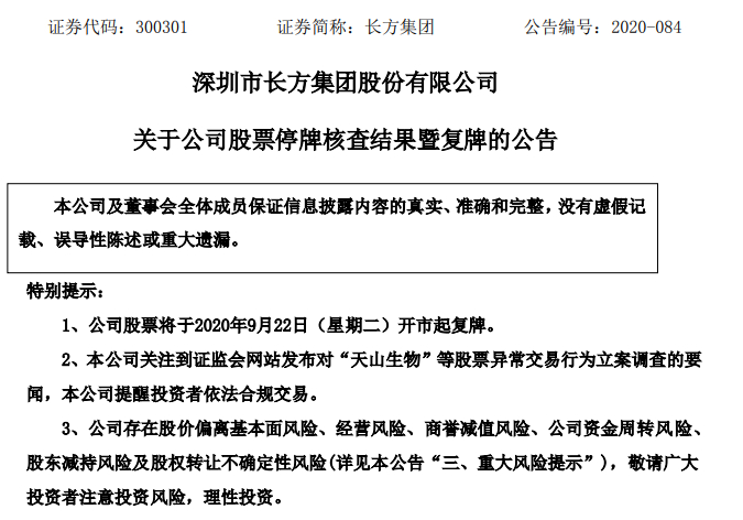 创业板三只短期大牛股天山生物、豫金刚石、长方集团已完成停牌核查,9月22日起复牌交易。目前,天山生物等公司的异动交易已被证监会立案调查。