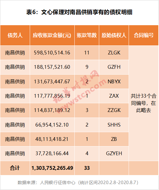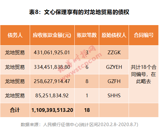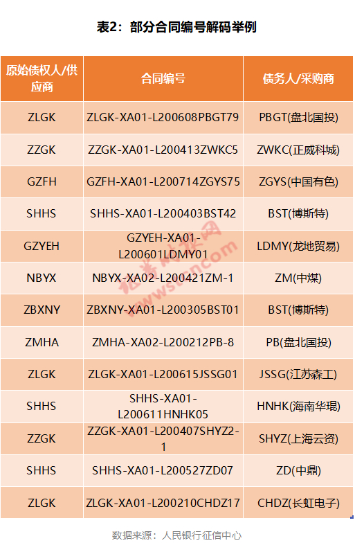 比如,图4中所列的第3条债务人信息显示,文心保理享有对龙岩市龙地贸易有限公司1523.25万元应收账款,合同编号为“GZFH-XA01-L200708LDMY61”,GZFH代表原始债权人(供应商),LDMY代表债务人龙地贸易(采购方)。
