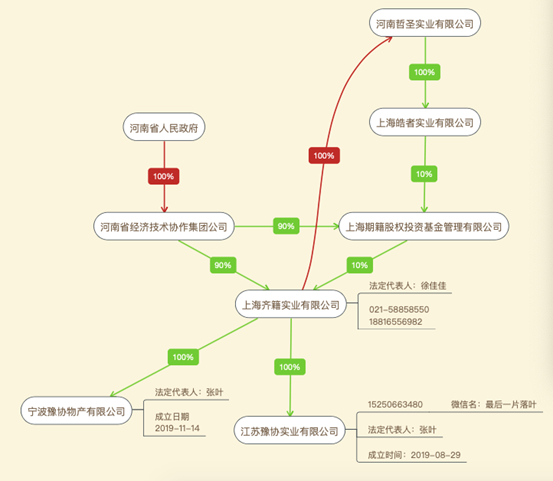 江苏豫协实业有限公司(下称“江苏豫协”)、宁波豫协物产有限公司(下称“宁波豫协”)分别成立于2019年8月及11月,注册资本分别为2亿元及1亿元,但皆未实缴。此外,二者主营业务皆为批发业,法定代表人均为张叶,且唯一股东均为上海齐籍实业有限公司(下称“上海齐籍”)。上海齐籍的股东结构就显得有些蹊跷,河南省人民政府的全资子公司河南省经济技术协作集团公司(下称“豫协集团”)持股90%,上海期籍股权投资基金管理有限公司持股10%(下称“上海期籍”)。继续查询股东背景会发现,豫协集团持有上海期籍90%股权,上海齐籍又透过河南哲圣实业有限公司、上海皓者实业有限公司持股上海期籍,上海齐籍的10%股权归属陷入循环(图5)。