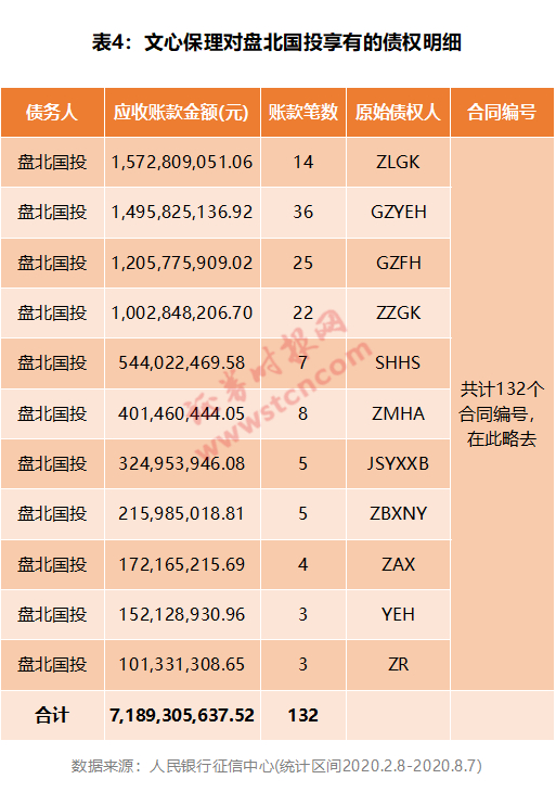统计数据显示,贵州盘北国投产业发展有限公司(简称“盘北国投”)为文心保理的第一大债务人。在统计时段内,ZLGK、GZYEH、GZFH、ZZGK等11个原始债权人,将总额71.89亿元的132笔应收账款转让给文心保理(表4)。