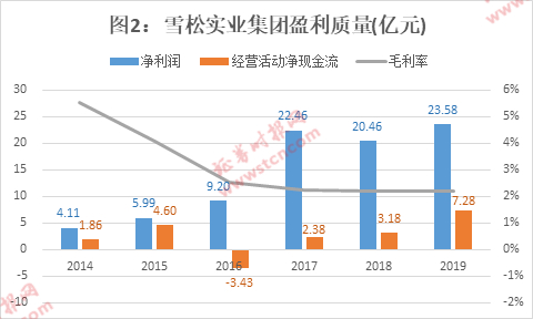 但即便雪松实业集团实现了净利润,也并未带来等量的经营净现金流。数据显示,其历年的经营净现金流都大大低于净利润。2014年至2019年,雪松实业集团的累计净利润为85.79亿元,而其同期累计的经营净现金流却仅为15.86亿元(图2)。这说明其盈利质量相当糟糕,所谓净利润都是纸面利润,真正变成了现金的20%都不到。