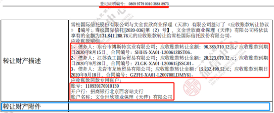 雪松信托对从文心保理所受让的每一笔应收账款,都在中登网进行了登记。比如,登记编号为0869 9779 0010 3884 8973的登记信息中,登记了三笔应收账款,分别记录了债务人名称、应收账款金额、应收账款到期日、合同编号、文心保理的回款账户等信息(图4)。