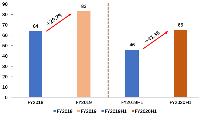 同时,公司费用率持续改善,FY2020H1管理费用率为15.3%,较上年同期下降2.1pct;FY2020H1销售费用率为8.6%,较上年同期下降3.7pct;研发费用率则为3.4%,与上年同期基本持平。