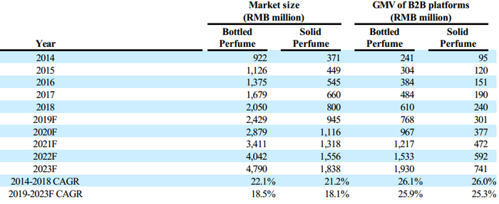公司深耕的车用香氛领域,展现了比行业平均更高的景气度。2018年,车用瓶装香氛与固体香氛B2B GMV为6.1亿元和2.4亿元人民币,预计未来五年的CAGR为25.9%和25.3%。