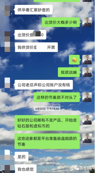 六月份的时候反传销365网还接到一名华奢汇商城的供货商的投诉,讲述华奢汇商城已经拖欠自己货款70余万,当时还和对方聊到该公司离最终崩盘已经没几天了。